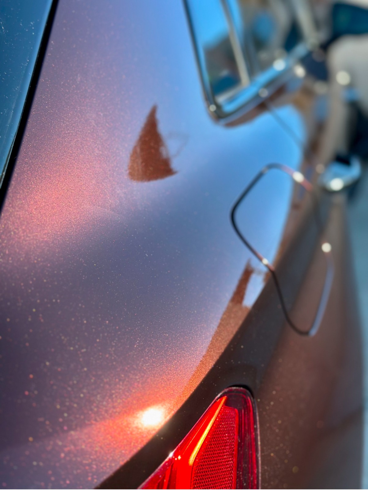 Cette teinte noire métallisée intègre une paillette métallique rouge, offrant une variété de couleurs du noir profond au rouge intense à travers différentes teintes de marron selon les courbes de la voiture et l'angle de la lumière.